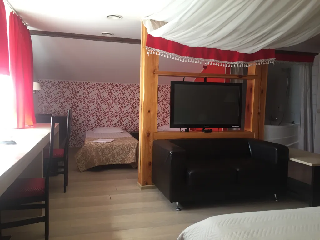 Планировка: Просторная комната, совмещающая спальню и зону отдыха.